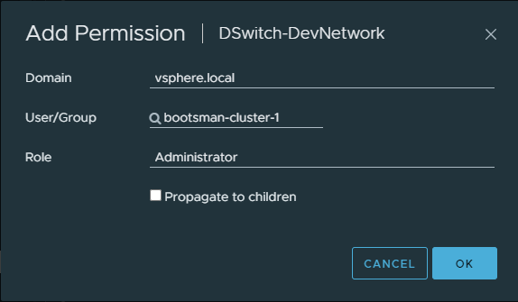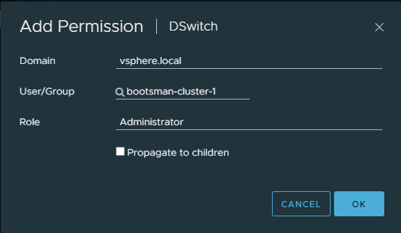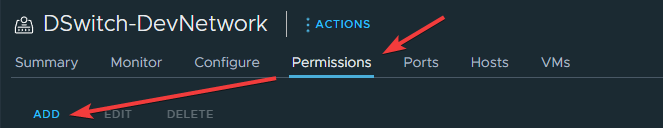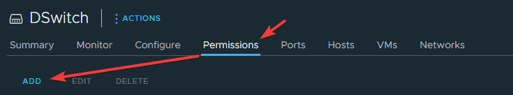 Выберите DSwitch, который будут использовать будущие виртуальные машины, перейдите в Permissions и нажмите ADD