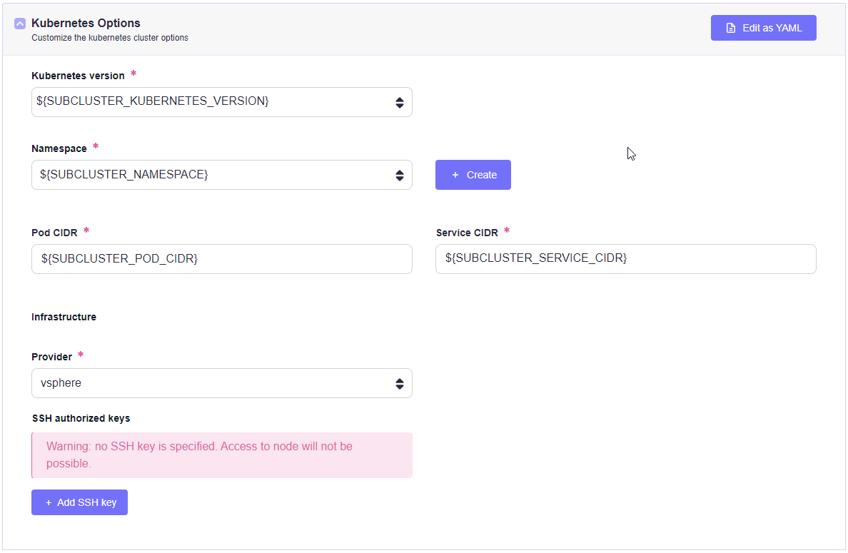 | ${SUBCLUSTER_NAMESPACE} | Namespace управляющего кластера, который будет содержать объекты подчинённого кластера | |