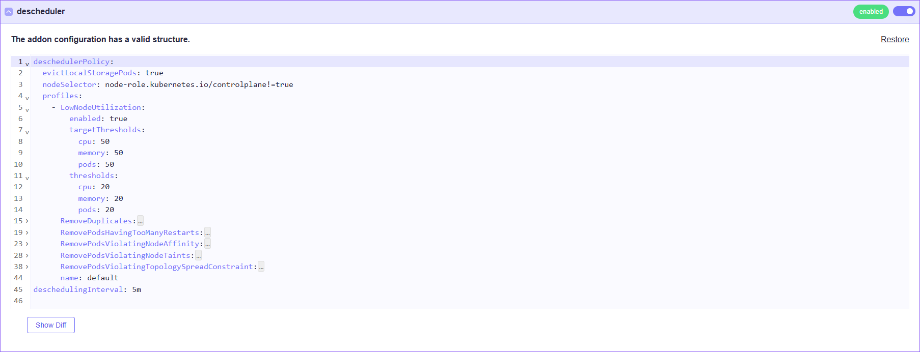 | deschedulingInterval | Интервал запуска проверки descheduler | |