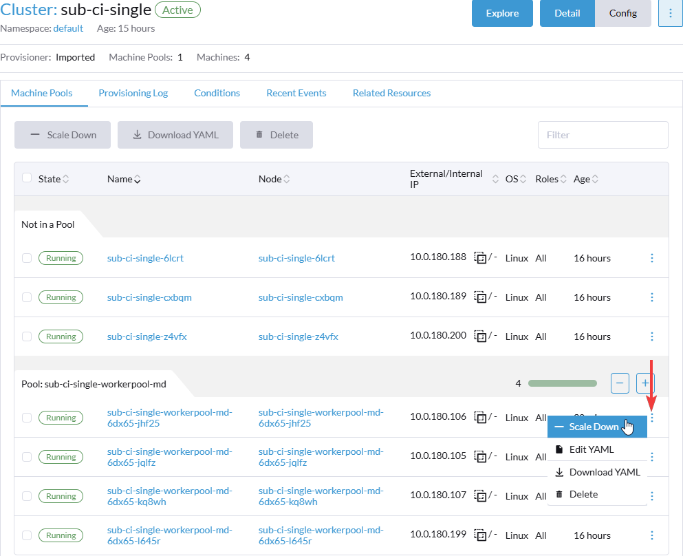 Выберите интересующий кластер и нажмите на его имя. Управления узлами для управляющего и подчиненного идентично.