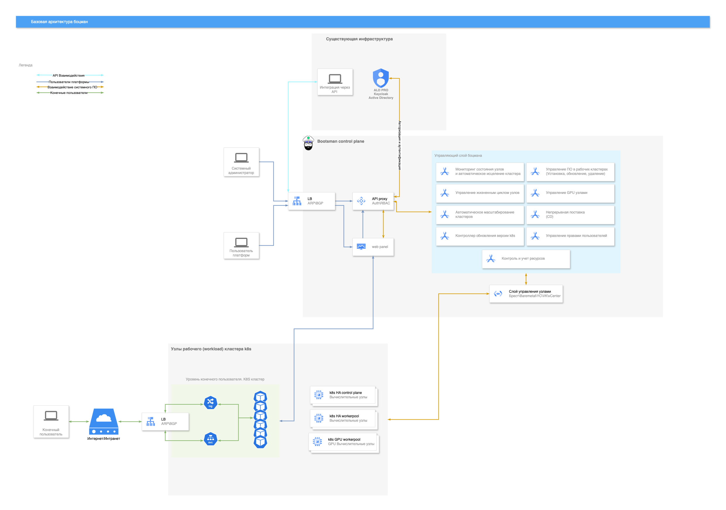Платформа Боцман легко интегрируется с имеющейся инфраструктурой и поддерживает совместную работу с существующими сервисами аутентификации, авторизации, мониторинга, резервного копирования и информационной безопасности.