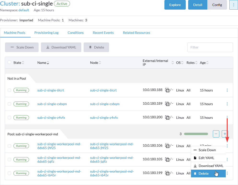 При удалении с уменьшение числа узлов, удостоверьтесь, что сумма реплик WorkerPool целевого кластера после уменьшения будет все еще больше 3