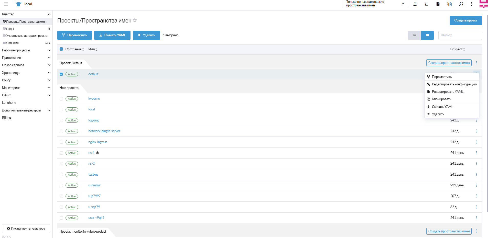 • Удалить – позволяет удалить выбранный из списка проект или пространство имен из кластера