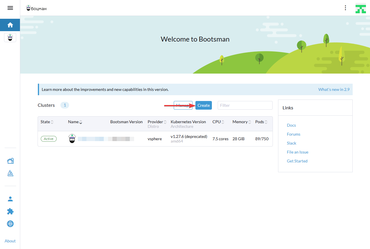 Для создания подчинённого кластера авторизуйтесь в управляющий кластер и нажмите кнопку
