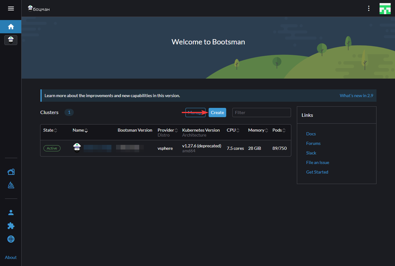 Для создания подчинённого кластера авторизуйтесь в управляющий кластер и нажмите кнопку