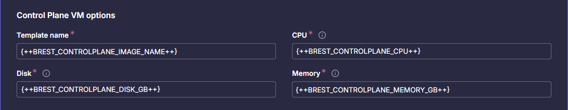 | BREST_CONTROLPLANE_IMAGE_NAME | Имя шаблона виртуальной машины, из которого будут созданы новые узлы с ролью master |