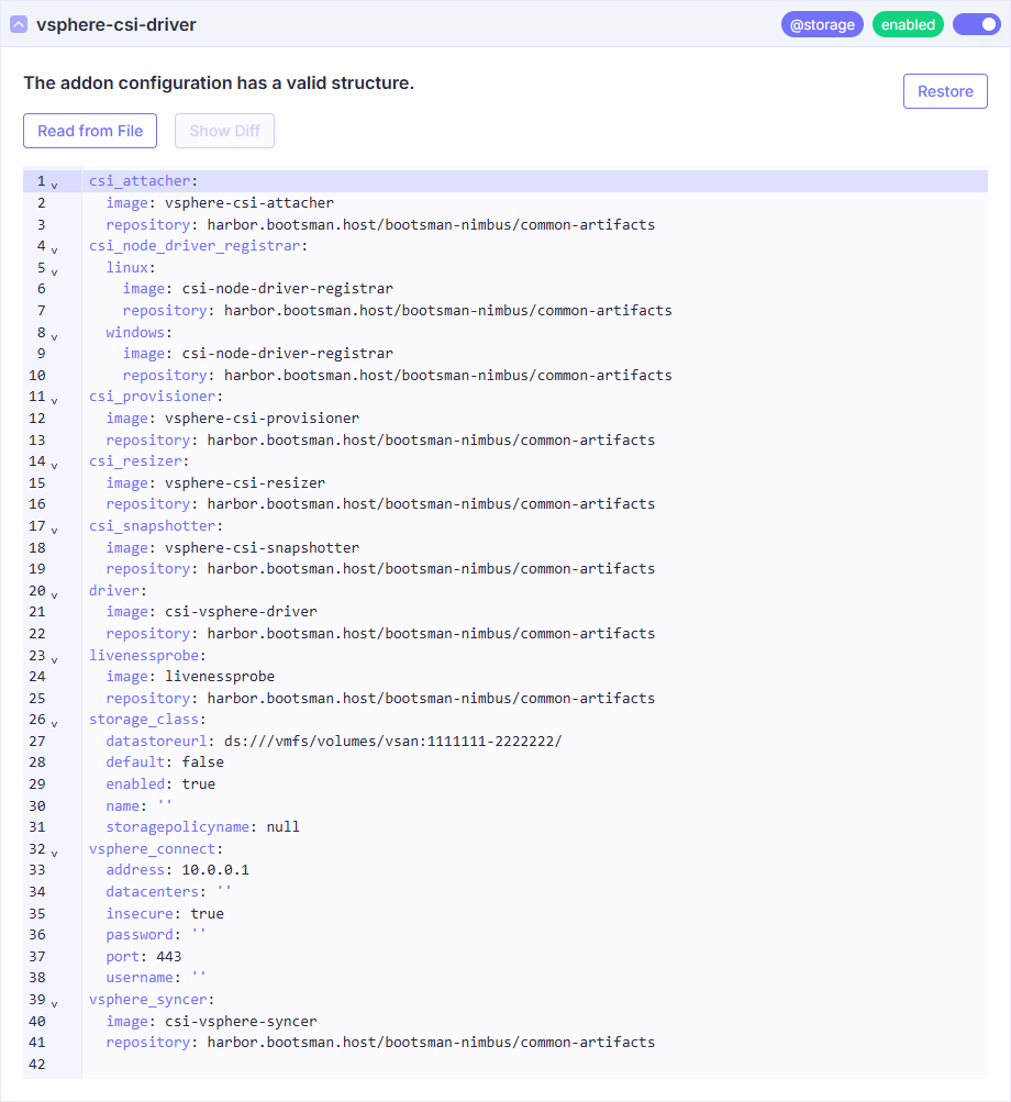 В случае если vSphere CSI является единственным модулем хранилища данных, измените значение storage_class.default с false на true: