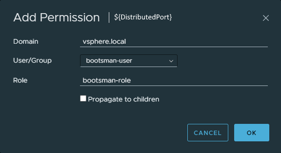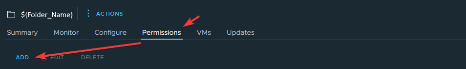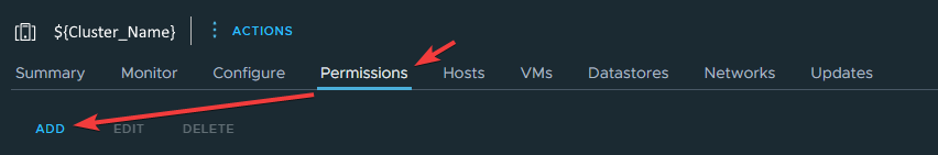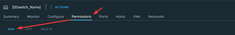 Выберите DSwitch, который будут использовать будущие виртуальные машины, перейдите в Permissions и нажмите ADD