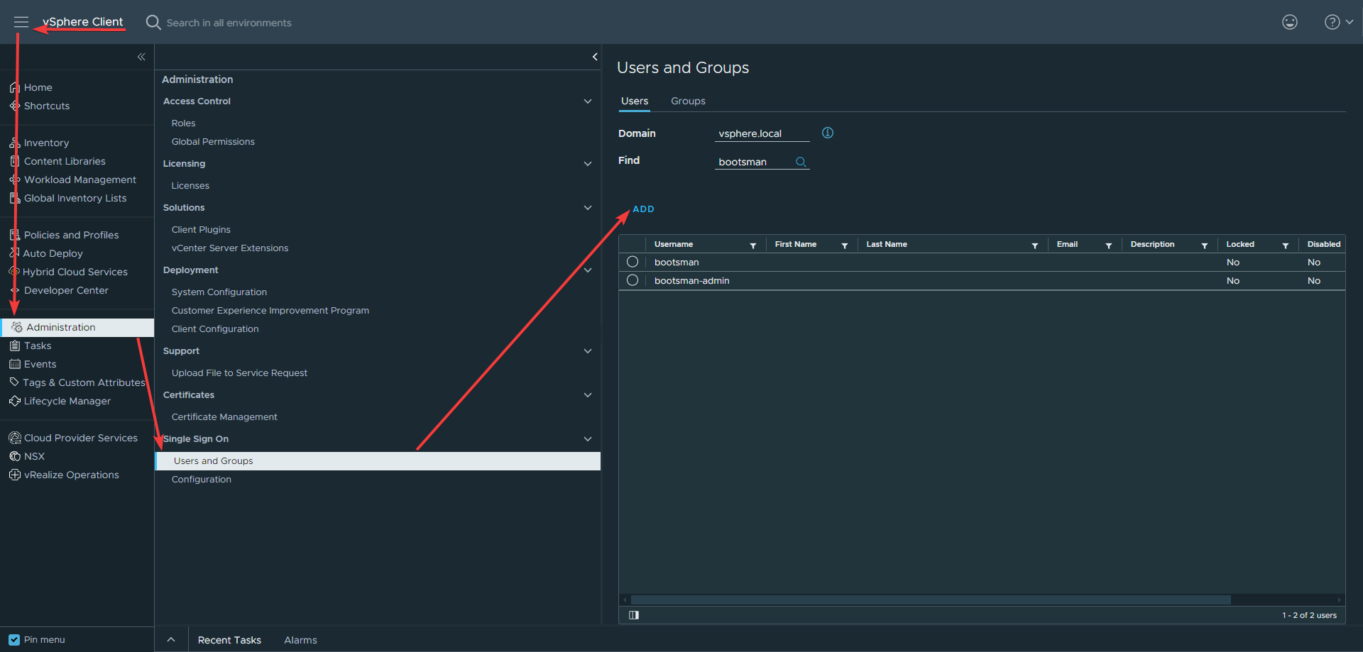 Управление пользователями и группами происходит в web-интерфейсе vCenter: