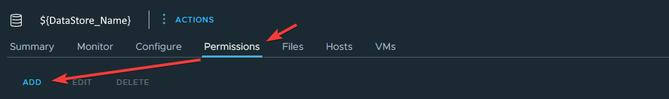 Выберите DataStore, который будут использовать будущие виртуальные машины, перейдите в Permissions и нажмите ADD