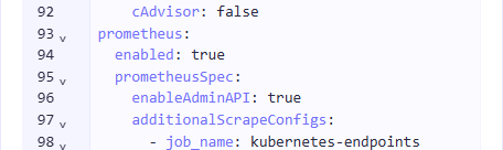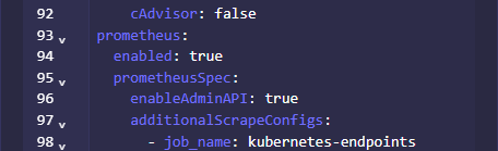 apiVersion: addon.bootsman.tech/v1alpha1 kind: Config ... spec: enabled: true values: ... prometheus: prometheusSpec: enableAdminAPI: true ... -