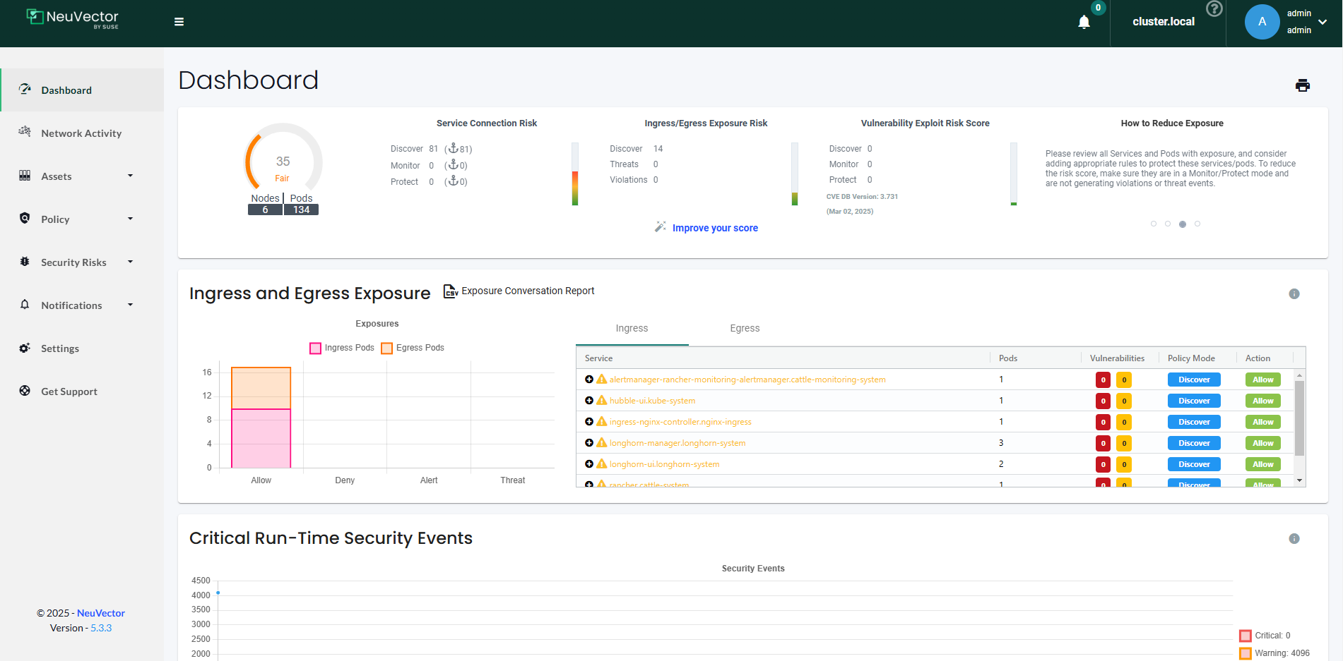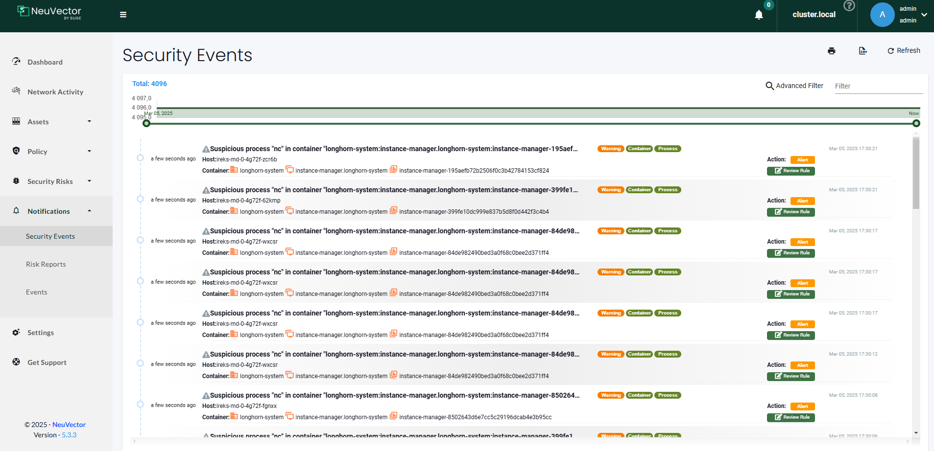 Меню Notifications позволяет просмотреть события безопасности в кластере neuvector_16