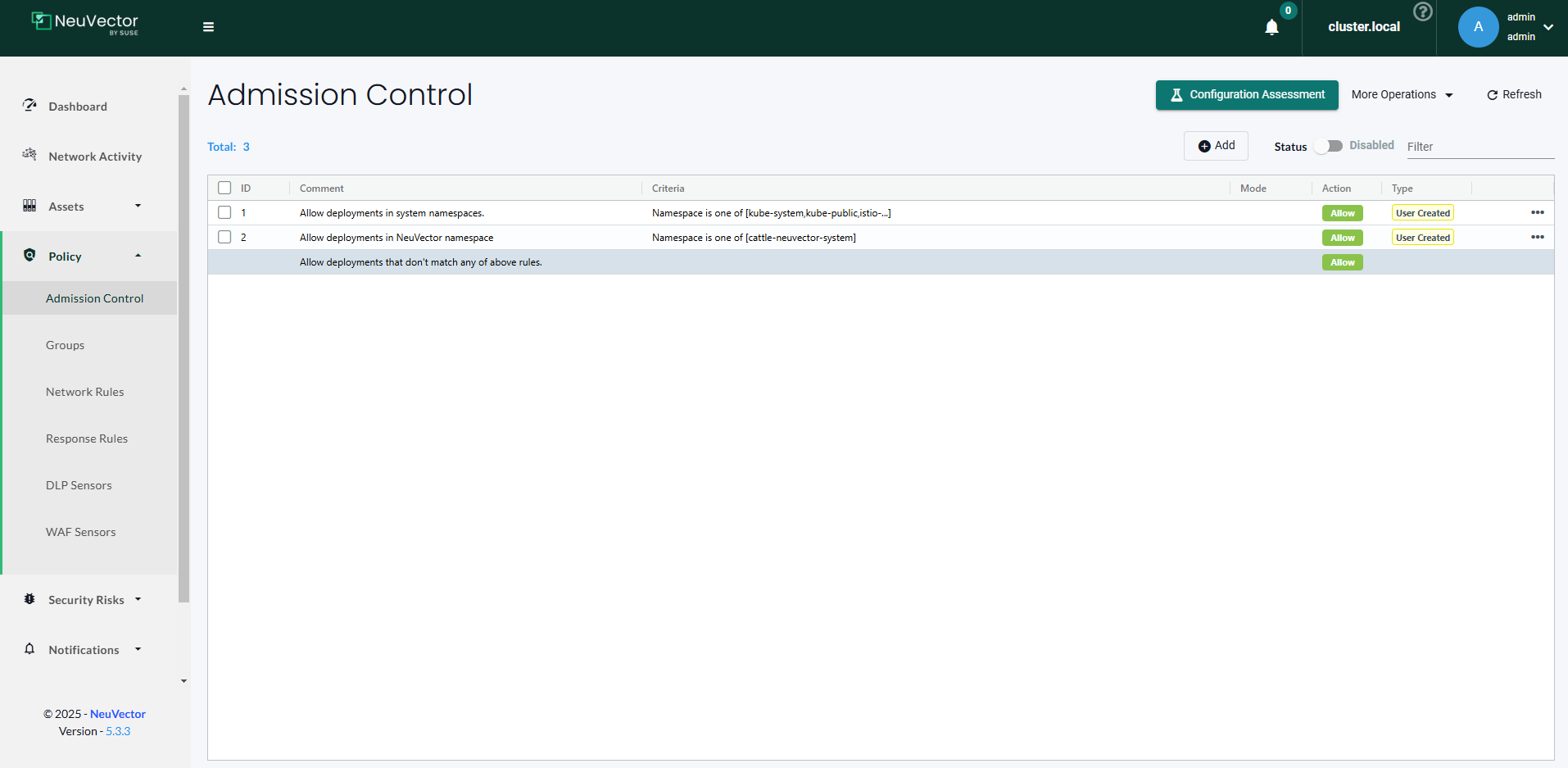 Меню Policy позволяет управлять политиками безопасности, используемыми в кластере: