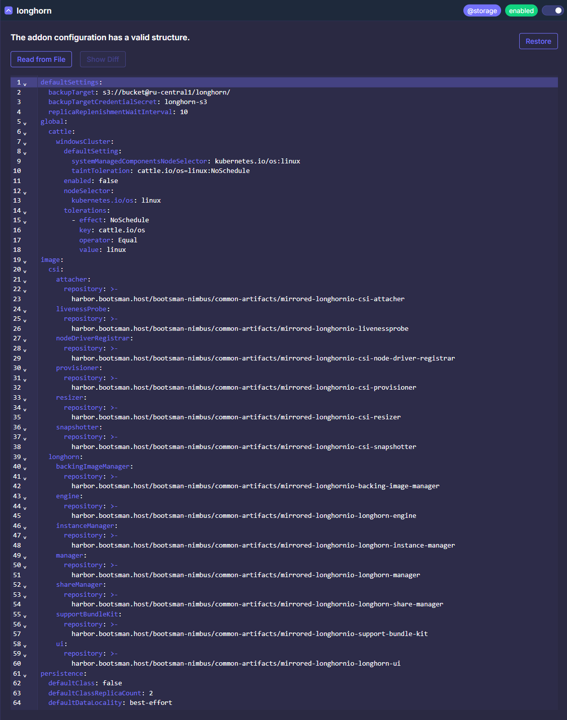 В случае если Longhorn является единственным модулем хранилища данных, измените значение: