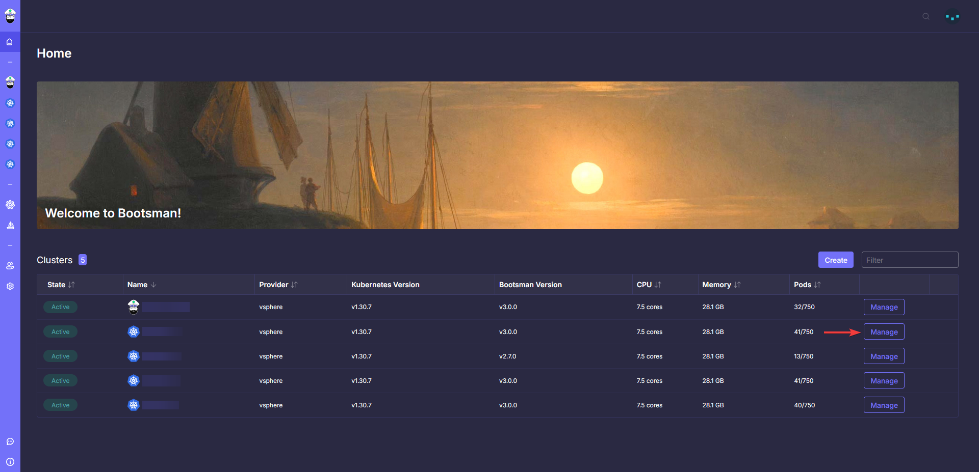 Войдите в Web-интерфейс bootsman и на главной выберете "Manage" для кластера, который требуется обновить.