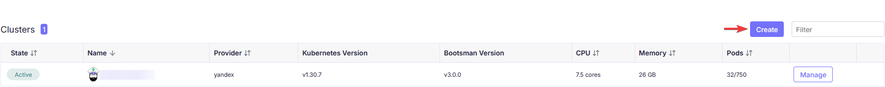 Для создания подчинённого кластера авторизуйтесь в управляющий кластер и нажмите кнопку Кнопка Создания Подчинённого Кластера
