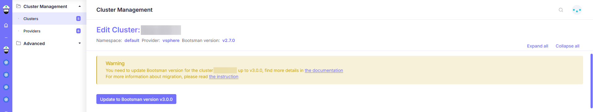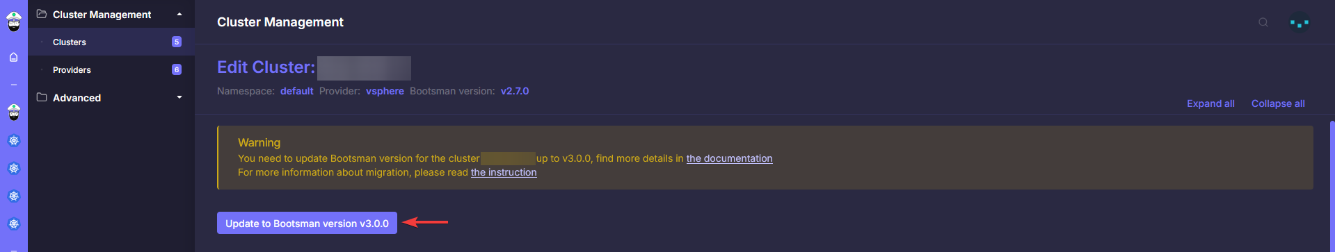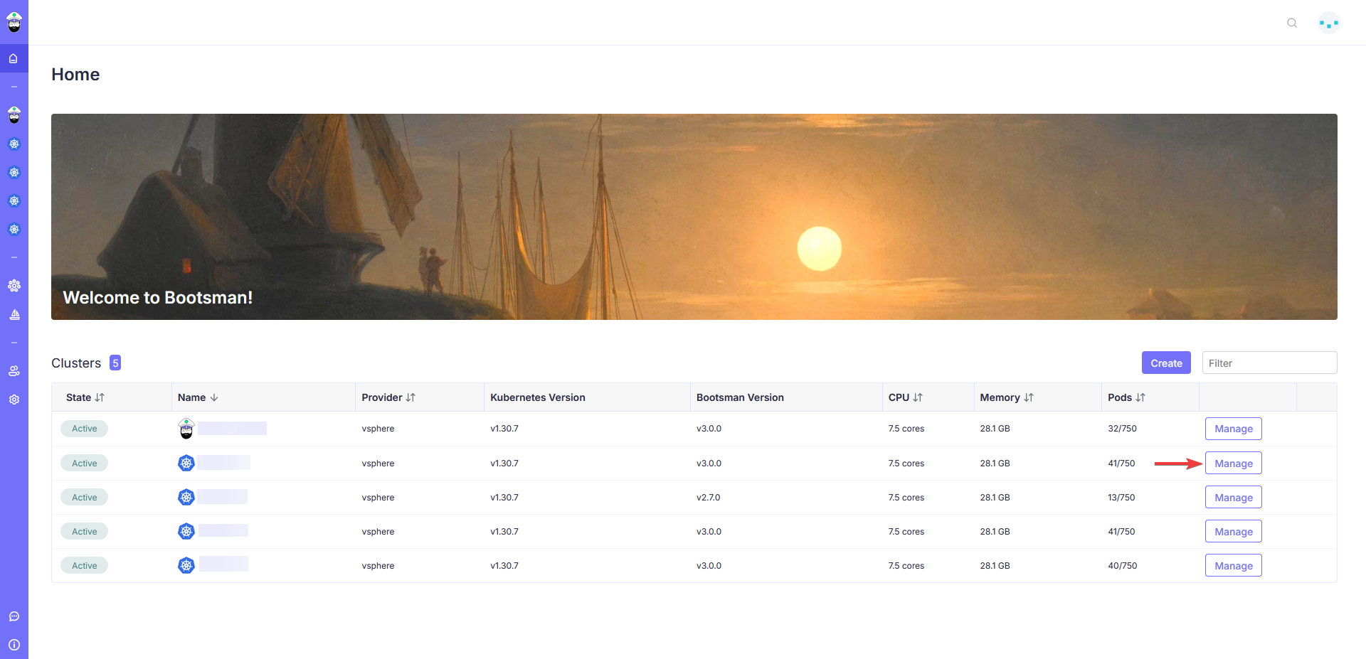 Войдите в Web-интерфейс bootsman и на главной выберете "Manage" для кластера, который требуется обновить.