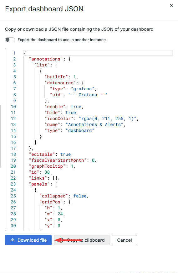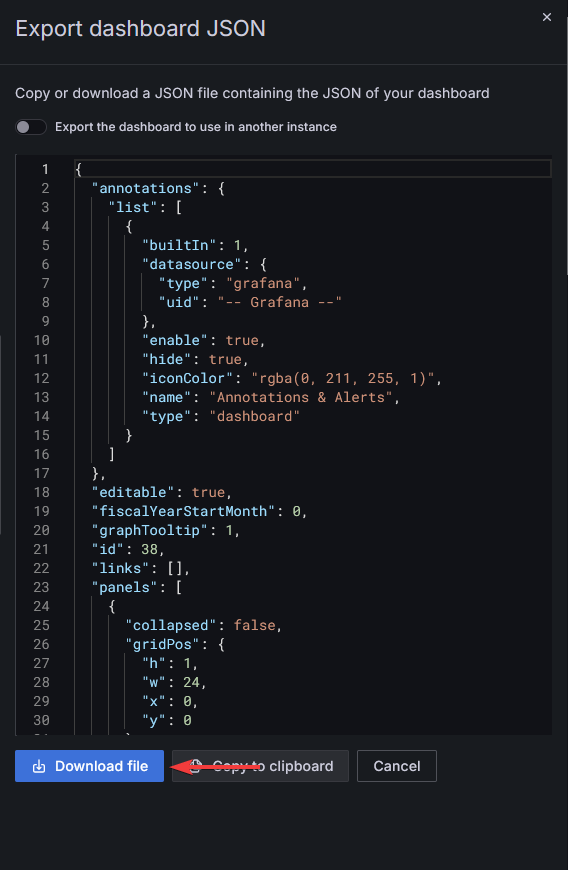 - Произвести экспорт каждого дашборда, которые были добавлены вручную